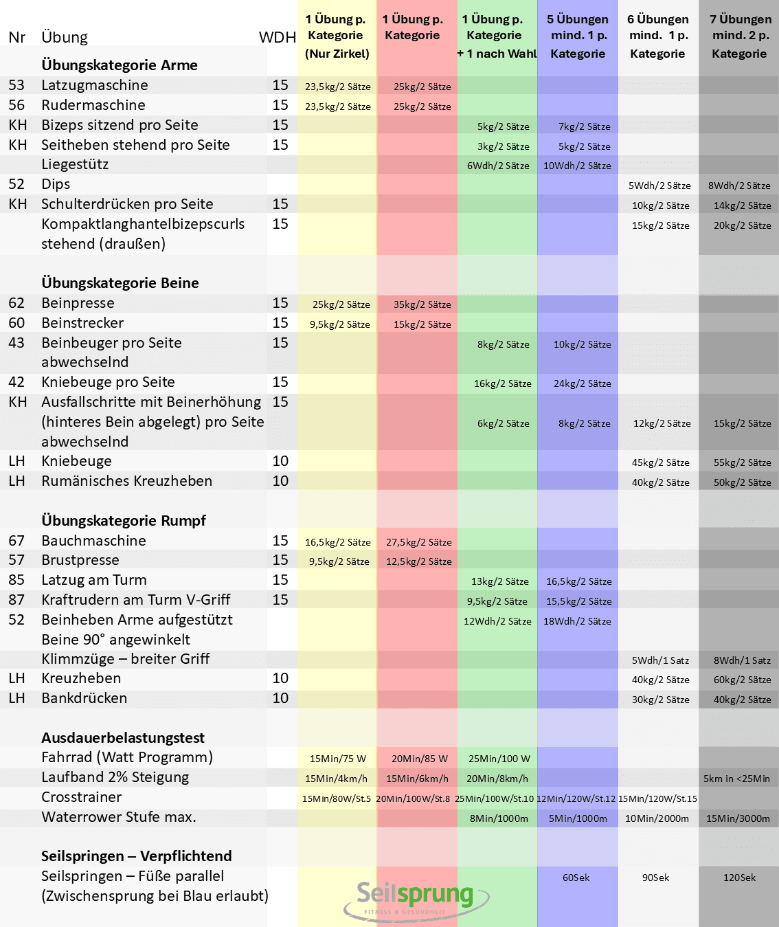 Bankdrücken ist sicherlich für schwere Menschen i.d.R. einfacher als für leichtere Menschen, aber eine Kniebeuge ist für kleinere Menschen i.d.R. einfacher als für größere, das liegt am Hebeleffekt des Oberschenkels. Wenn man also argumentiert, dass ein schwerer Mensch beim Bankdrücken Vorteile hat bzw. eine leichtere Person hier im Nachteil ist, dann müsste man umgekehrt auch berücksichtigen, dass kleinere Menschen Vorteile bei der Kniebeuge haben und leichtere Menschen Vorteile beim Seilspringen oder Kardio-Übungen. Würde man aber all diese Parameter für die jeweilige Übung berücksichtigen käme ein extrem komplexes System dabei heraus, was wir nicht möchten. Das Deutsche Sportabzeichen im Vergleich differenziert ausschließlich nach Alter, bezahlt dies aber schon mit einer recht hohen Komplexität, obwohl es mit den drei Einteilungen Bronze, Silber, Gold gegenüber den 7 Bändchenfarben von Seilsprung viel einfacher sein müsste.